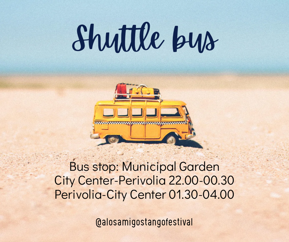 For the convenience of our festival participants we offer transfers to the evening milonga venue, with a shuttle bus, scheduled as follows: